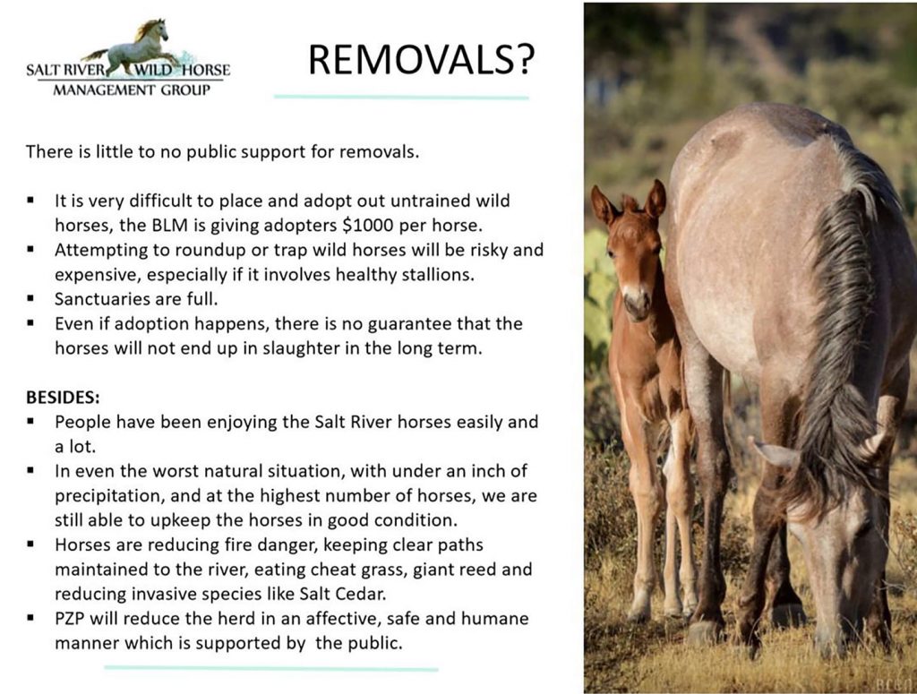 - NO REMOVALS of Salt River wild horses, except if determined in five years that our PZP fertility control program has not reduced the herd size by decreasing birth rates and through natural attrition.